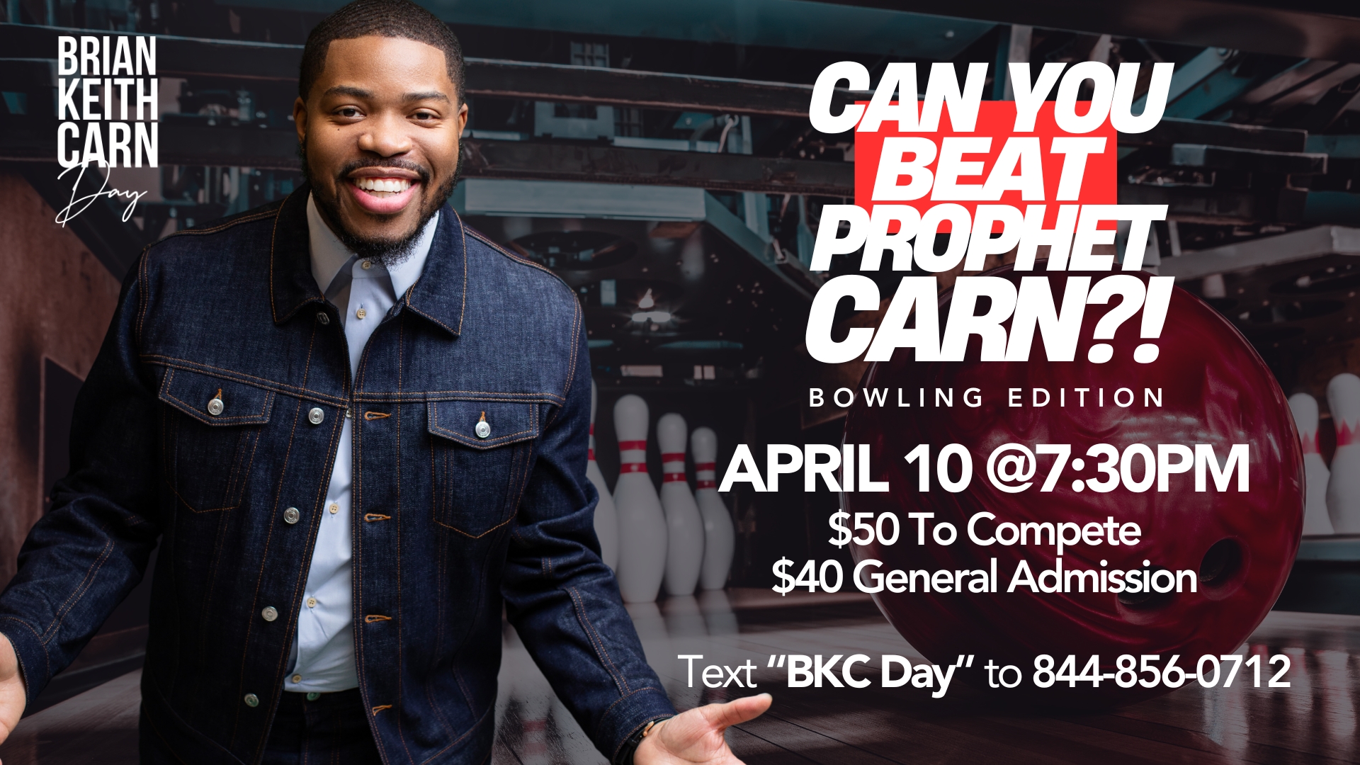 As we celebrate Brian Keith Carn Day in April 2026, register to be a part of the “Can You Beat Prophet Carn?!” Bowling Edition at Spare Time Bowling Alley (Pineville) on April 10th from 7:30pm to 10:00pm. The cost to compete is $50, and general admission is $40. Both include food, shoe rental, and bowling lanes. Those competing will have a chance to beat Prophet Carn in bowling! Register by April 3rd to compete in or attend this event. Text “BKC Day” to 844-856-0712 or click HERE!