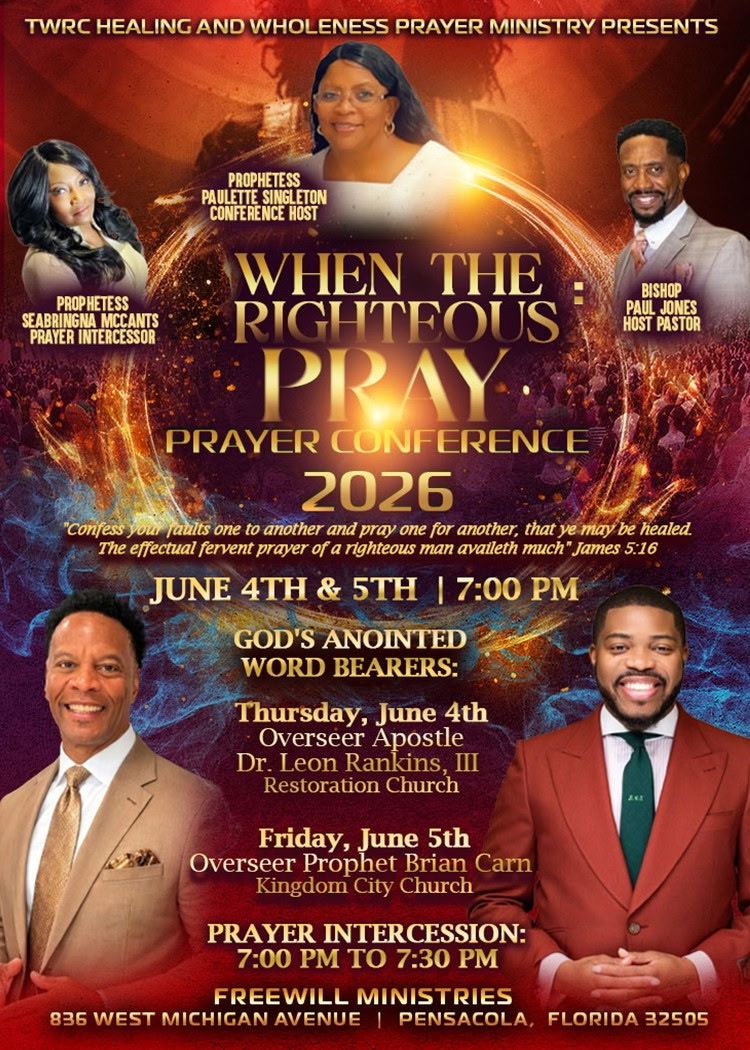 TWRC Prayer Conference 2026 (Pensacola, FL) + Add to Google Calendar + iCal export Date Jun 05 2026 Time 7:00 pm Location Freewill Ministries 836 West Michigan Ave, Pensacola, FL 32505 Organizer Prophetess Paulette Singleton Next Event Journey Through the Word Bible Study (Atlanta, GA) Date Jun 10 2026 Time 7:00 pm Share this event